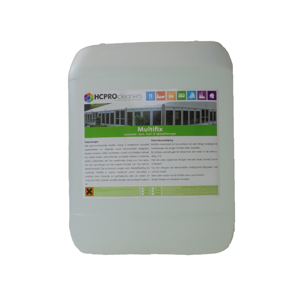Multifix is een geconcentreerde alkalische reiniger die speciaal is ontwikkeld voor het reinigen en onderhouden van kunststoffen en andere waterbestendige materialen. Dankzij de combinatie van weekmakers en krachtige surfactants worden oliën, vetten en hardnekkig vuil snel opgelost, terwijl het kunststof soepel blijft en zijn oorspronkelijke uitstraling behoudt. Multifix is breed inzetbaar voor uiteenlopende oppervlakken zoals dekzeilen, tentdoeken, kunststof kozijnen en rubber boten.