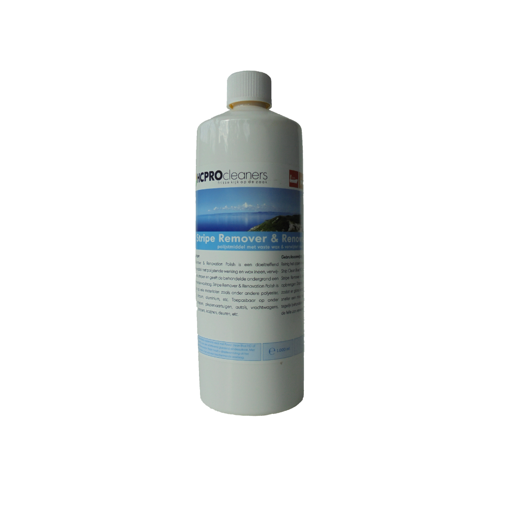 HCPRO Stripe Remover & Renovation Polish is een effectief reinigings- en polijstmiddel dat in één behandeling zwarte regenstrepen verwijdert en direct een beschermende waxlaag achterlaat. Ideaal voor het onderhouden van campers, caravans, boten, voertuigen, kozijnen, trespa en andere gladde oppervlakken. Het product is veilig toepasbaar op polyester, lakwerk, chroom en aluminium, en zelfs geschikt voor het verwijderen van zwarte strepen op vers schilderwerk.