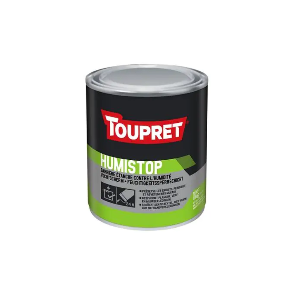 Toupret Humistop is een gebruiksklare vochtblokker die wordt toegepast op muren en plafonds die zijn aangetast door vocht. Het product voorkomt doorsijpelen, loskomend behang en bladderende verf, waardoor oppervlakken weer geschikt worden voor afwerking. Humistop is geschikt voor binnen en buiten, op niet-sijpelende ondergronden zoals cement, baksteen, steen en bestaande verflagen.