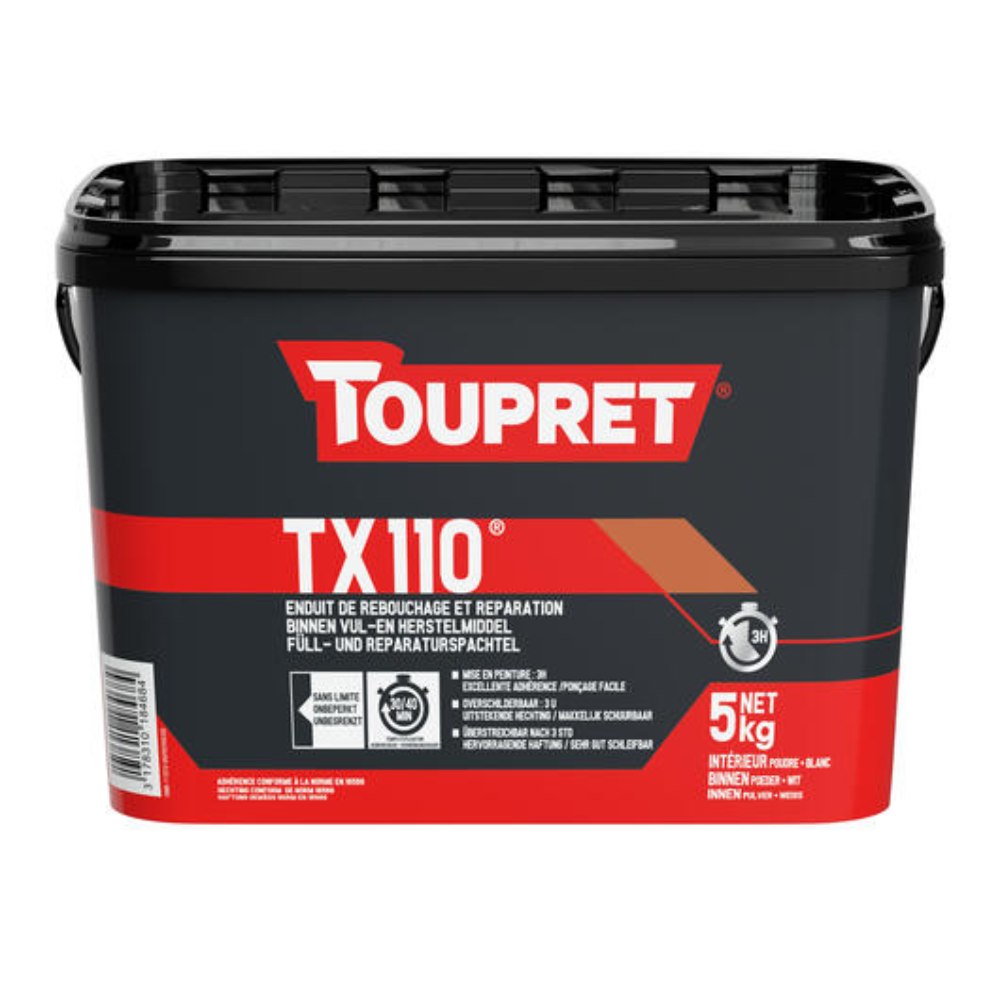 Toupret TX110 is een snel drogend binnenvulmiddel in poedervorm, ideaal voor wie tijd wil besparen bij het vullen en herstellen van gaten, scheuren en beschadigingen. Het hecht uitstekend op vrijwel alle gebruikelijke binnenondergronden, zoals gips, gipskarton, beton, baksteen, steen en oude verflagen. Ook geschikt voor voorbehandeld hout.