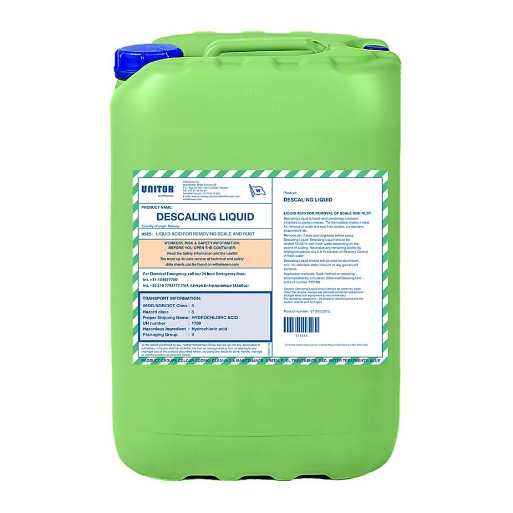 Wilhelmsen Unitor Descaling Liquid is een sterk zuurhoudend reinigingsmiddel met corrosieremmers, ontwikkeld voor het snel en effectief verwijderen van kalk, roest en hardnekkige aanslag. Het product is ideaal voor technische installaties aan boord, zoals warmtewisselaars, condensers, evaporators en boilers. Ook wordt het veel gebruikt in combinatie met Unitor Cargo Hold Cleaning Kits om ladingresten zoals cement en lime wash uit laadruimen te verwijderen.
